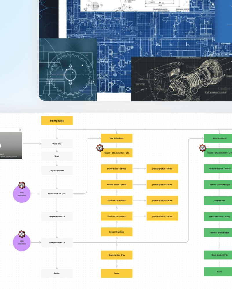 In the old website, pages was filled by all sort of CTA (colors, shapes) and with different purpose. The previous work done on the branding part help to homogenize the components and brings more consistency. Also, in order to bring value and impact to their business, I reduced the number of choices users had in one place, focusing on a few main actions (the most important ones). In keys part, I decided to add some catchy animations to engage users a little further: they have been handled by Yann Testu (Motion Designer) under my guidelines and vision for the project.